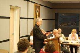 Bishop Sample began the day with a challenge for the packed room to ponder the Year of Priests and what it means to us and to the universal church. He first spoke of the responsibility of priests. Be zealous and be busy with your spiritual lives and ministry, he advised them. Dig deep in this dedication as St. Paul advised St. Timothy, I remind you to fan into flame the gift that God bestowed on you when we laid hands upon you. As a whole church we must once again appreciate the awesome gift God instituted on the eve of his Passion. At this God linked the Eucharist to the church forever. When a priest offers the Sacrament of the Eucharist it is the same sacrifice - but an un-bloody one - as at Calvary. As the priest offers it is the same victim and it is Christ in him that offers up the sacrifice. As we follow, he is in Persona Christi when in the celebration he says, This is my body which will be given up for you. The heart of our lives as Catholics comes from this Eucharist. Without the priest there is no Eucharistic sacrifice. We are dead. We must appreciate and love our priests because in them Christ loves us.